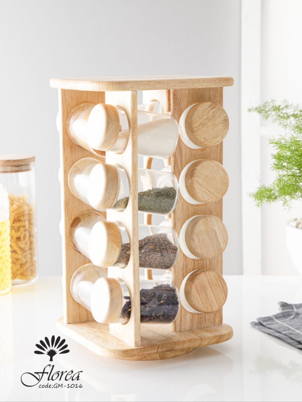 🎗️جا ادویه گردان فلورا چوبی – استند شیک و کاربردی ۱۶ تایی