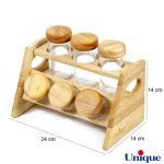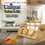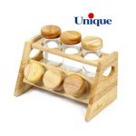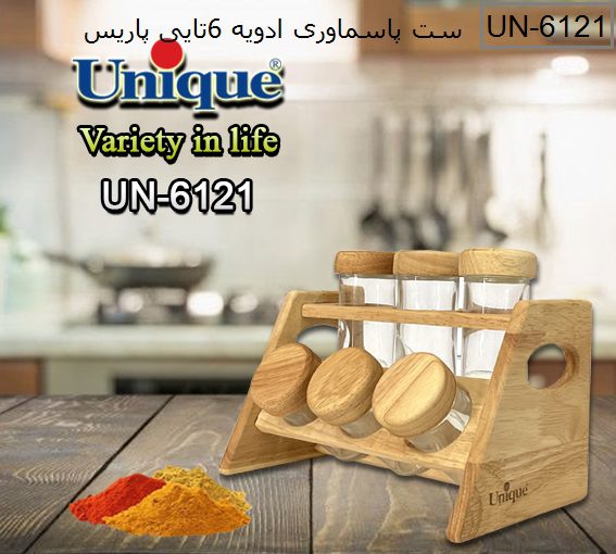 ظروف جا ادویه چوبی یونیک از تنوع بالایی برخوردار است، بدنه این ظروف اغلب از جنس شیشه است که باعث می شود این محصول به خوبی شسته شود و آلودگی باقی نماند و این را یک مزیت بهداشتی می توان در نظر گرفت. چیزی که وجه تمایز این ظرف های ادویه است جنس درب این ظروف است. ست ادویه 6 تایی کد 6121 درب چوبی دارد که باعث زیبایی بیشتر این ظروف شده است، همچنین پایه این ست نیز از جنس همین چوب است.