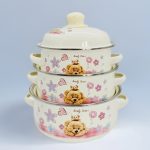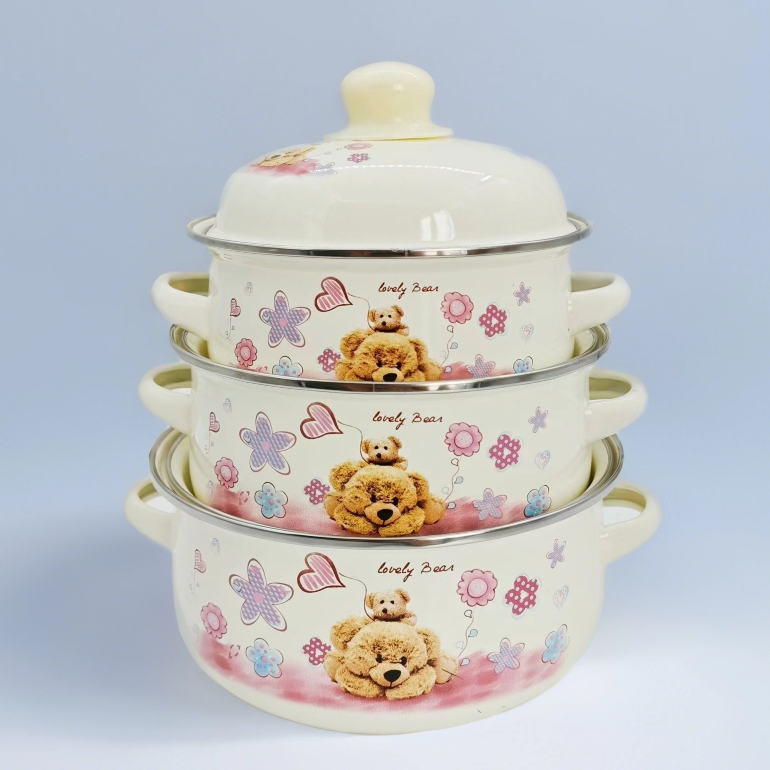 سرویس قابلمه لعابی مدل کودک طرح خرس شامل سه قابلمه در سایزهای16، 18، 20 سانتیمتر است.