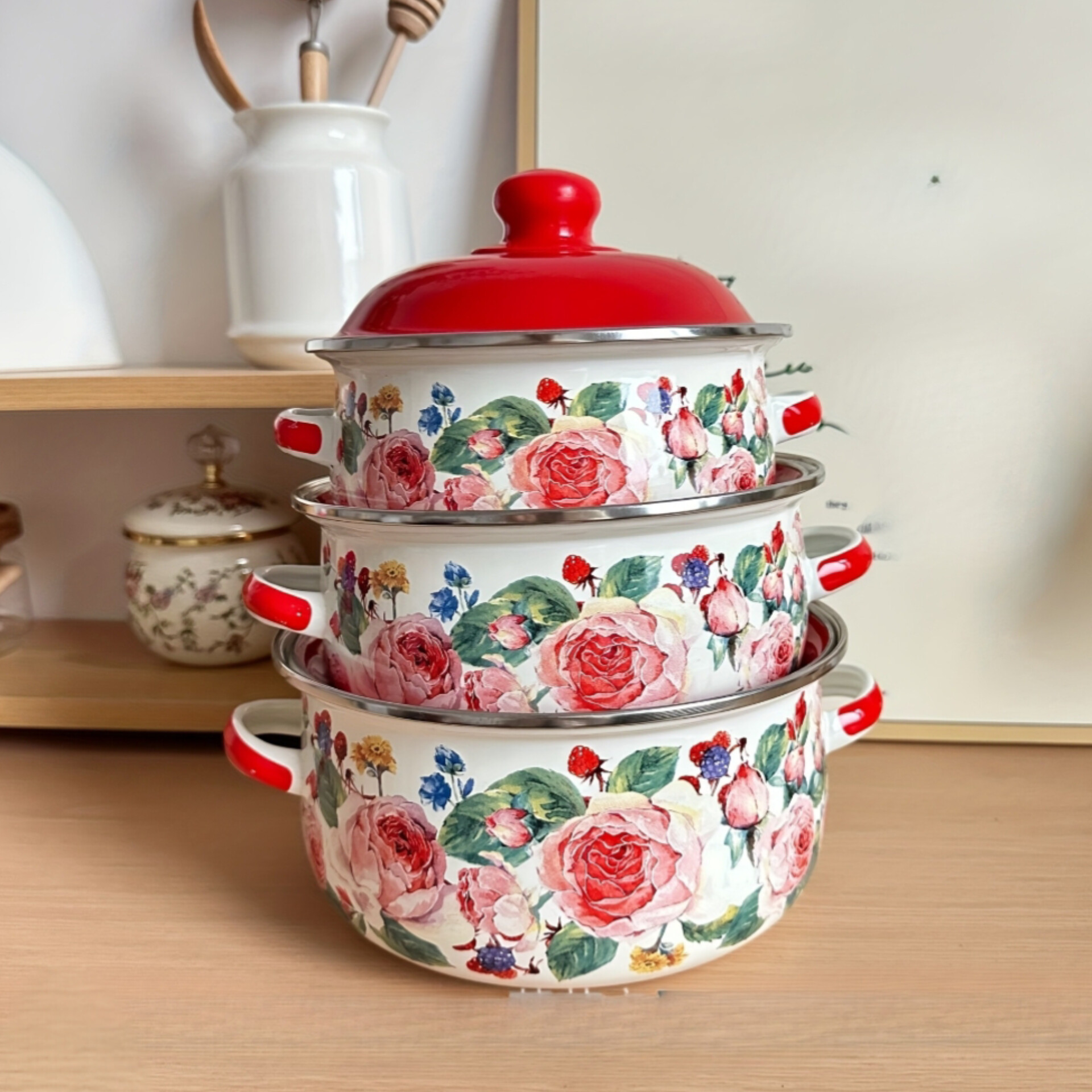 سرویس قابلمه لعابی مدل گلدار با درب قرمز شامل سه قابلمه در سایزهای16، 18، 20 سانتیمتر است.