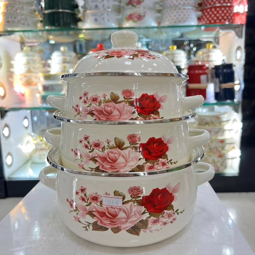 سرویس قابلمه لعابی مدل گل رز شامل سه قابلمه در سایزهای16، 18، 20 سانتیمتر است.