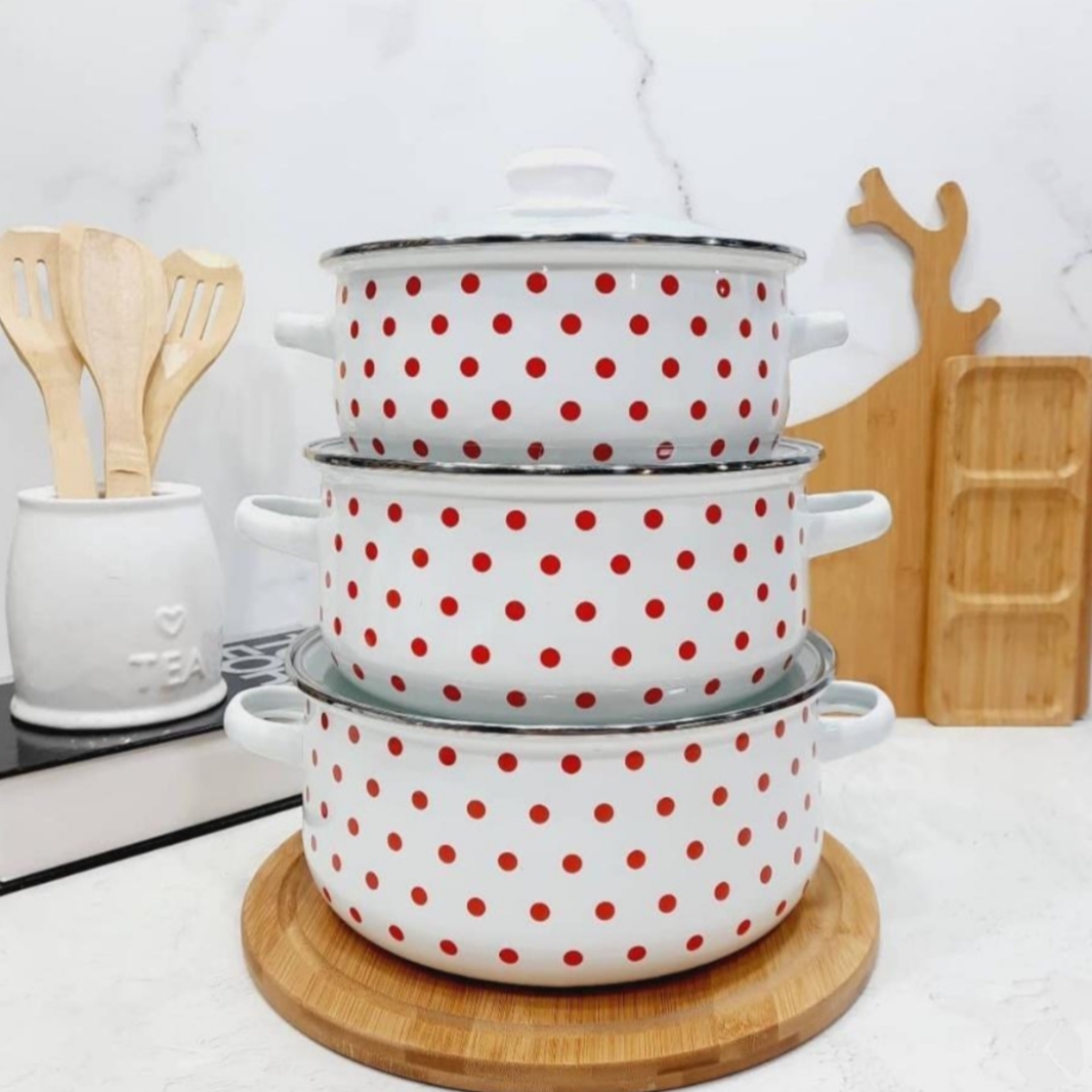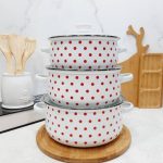 سرویس قابلمه لعابی Reoona مدل خالخالی شامل سه قابلمه در سایزهای ۱۶، ۱۸ و ۲۰ سانتیمتر است.