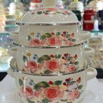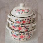سرویس قابلمه لعابی مدل گلدار شامل سه قابلمه در سایزهای16، 18، 20 سانتیمتر است.