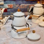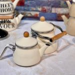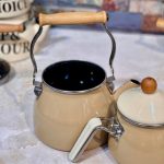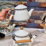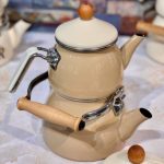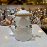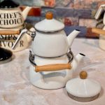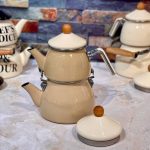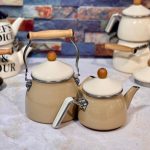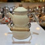 کتری و قوری تمام لعابی برند شاهین ساخت ترکیه دسته چوبی رنگ کرم؛سفید؛نسکافه اب