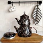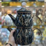 کتری و قوری تمام لعابی برند شاهین ساخت ترکیه طرح ماربل مشکی و کرم
