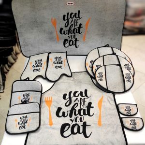 سرویس دمکنی ۱۱ پارچه کلاسیک طیف کرم شامل دم کنی، دستکش، دستگیره، پیش بند و نم گیر با پارچه کتان ضخیم و داخل پشم شیشه، مناسب برای آشپز خانههای شیک و مدرن.