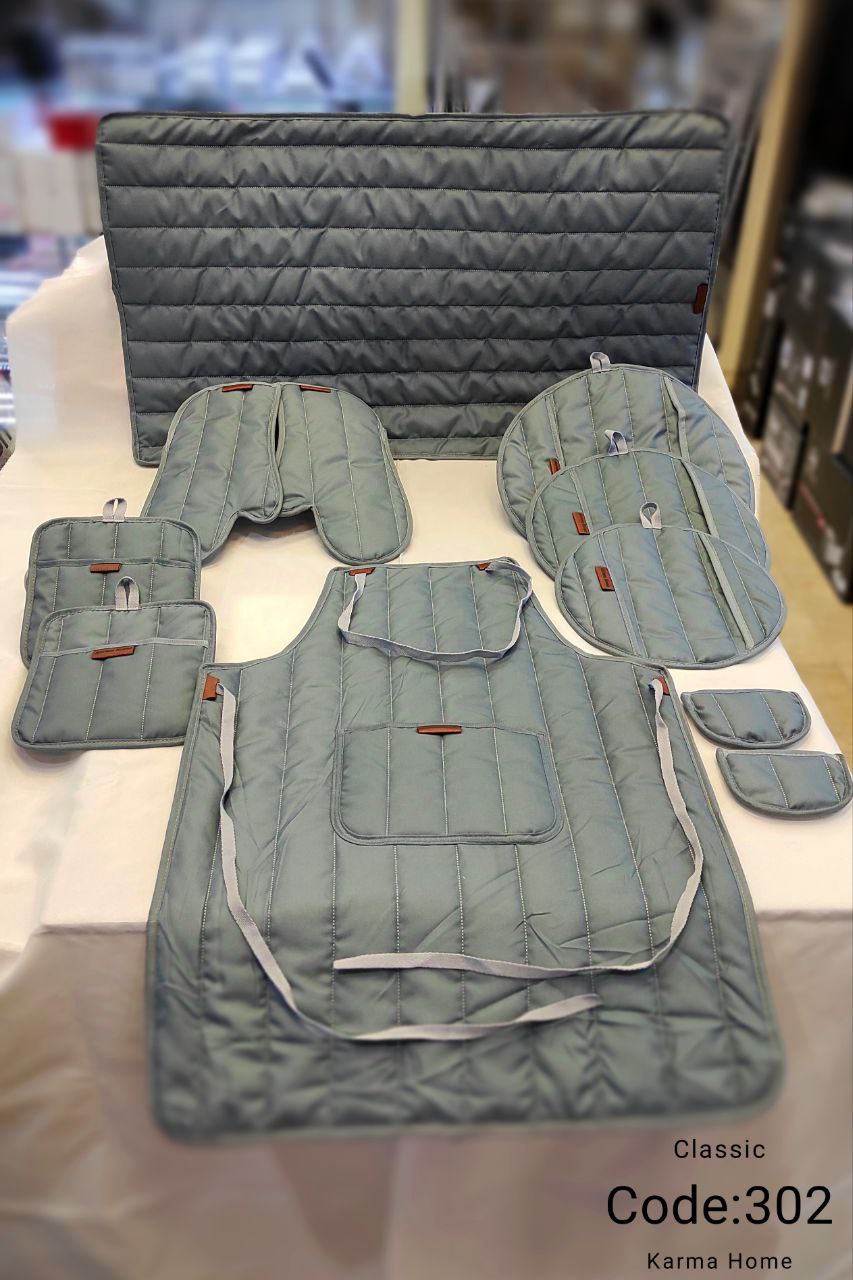 سرویس دمکنی ۱۱ پارچه کلاسیک طیف کرم شامل دم کنی، دستکش، دستگیره، پیش بند و نم گیر با پارچه کتان ضخیم و داخل پشم شیشه، مناسب برای آشپز خانههای شیک و مدرن.